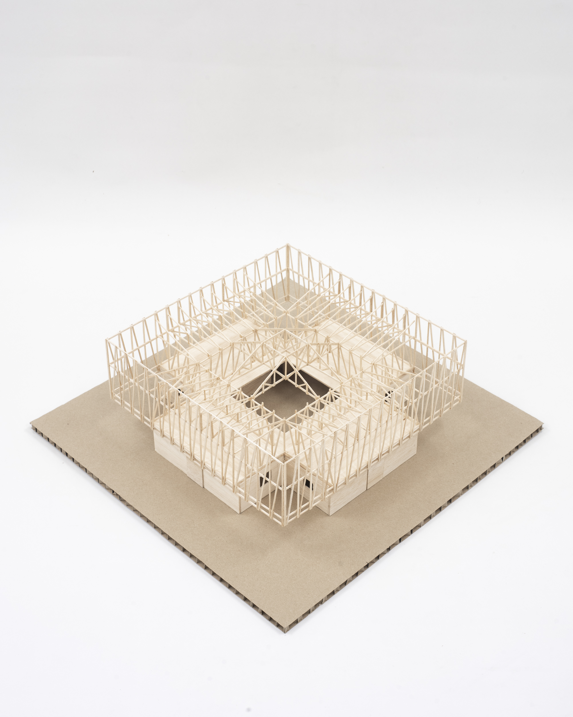 This goat dairy is located on a 100-year-old farm. The simplicity of the geometry of the project seeks not to compete with the original heritage buildings. On the ground floor a cross-shaped floor plan houses the production line. The first floor houses administrative offices and multi-purpose rooms for the community. A light, square-shaped straw cladding encloses the entire building, turning it into a large lamp that expresses both the materiality and the construction system of the traditional buildings.