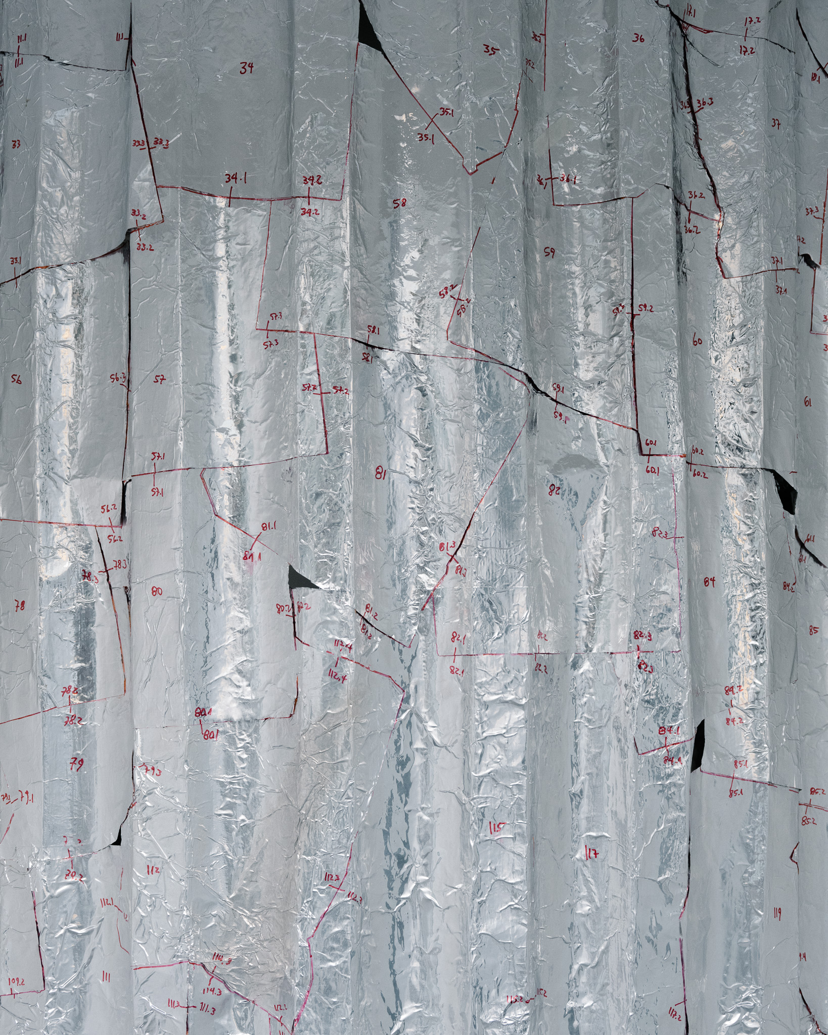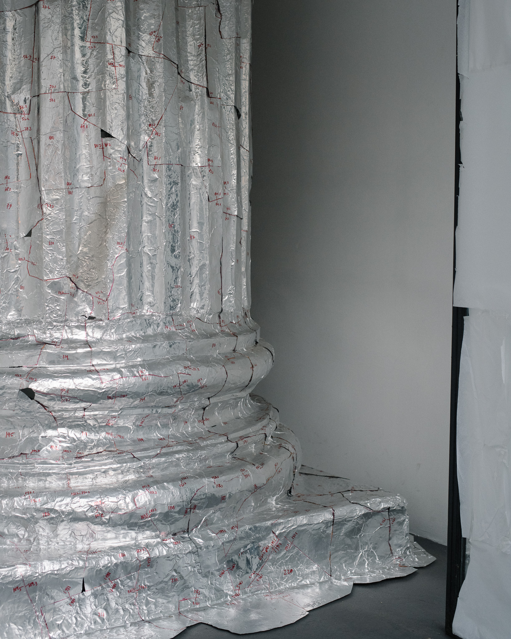 In the first case, the column is real; "Macizo," contradicting its name, is a mold made on-site with metal foil. The decontextualization of an object, aiming to question the concept of dimension and scale. A fragile and hollow body, an echo of a previous material presence.